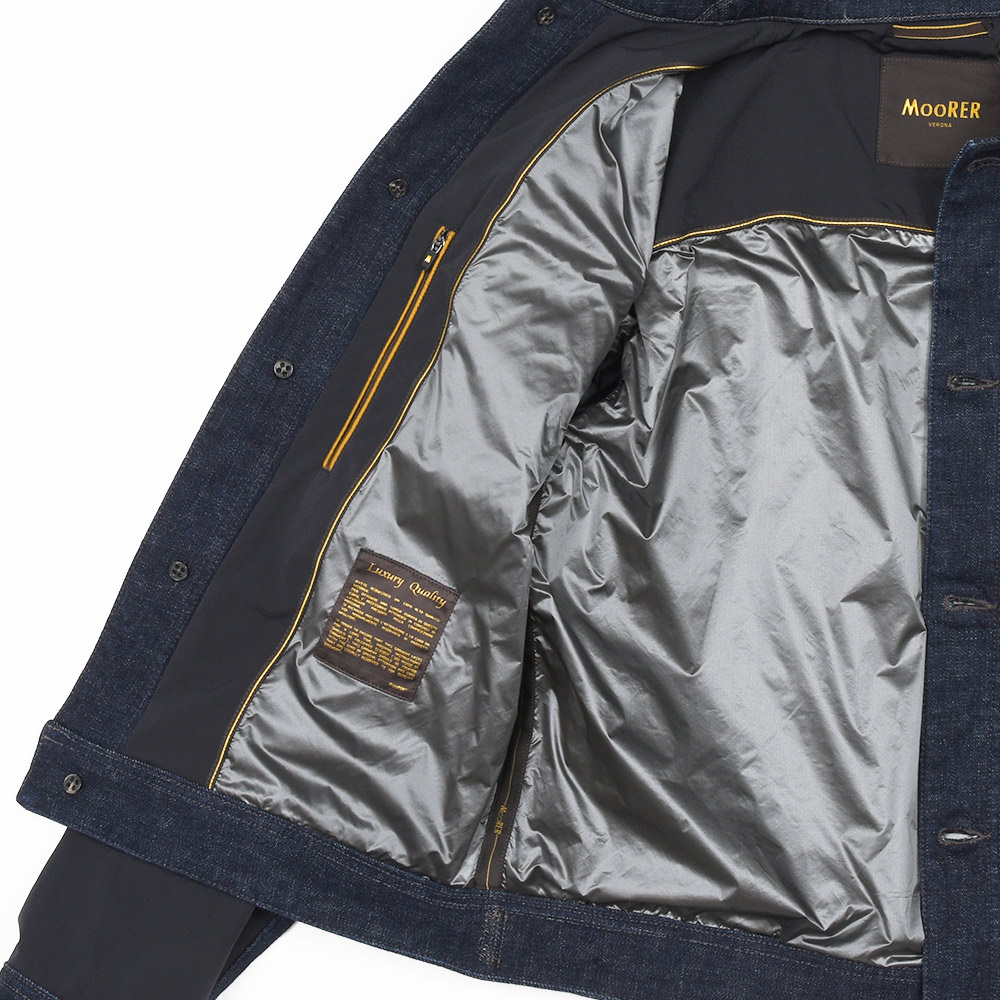 特注のスナップボタン、ファスナーやホーン釦などの拘りに、裏地のナイロン素材の美しさ加えてパイピング処理を施した丁寧な仕上げ。MooRERのアウターに死角はありません。