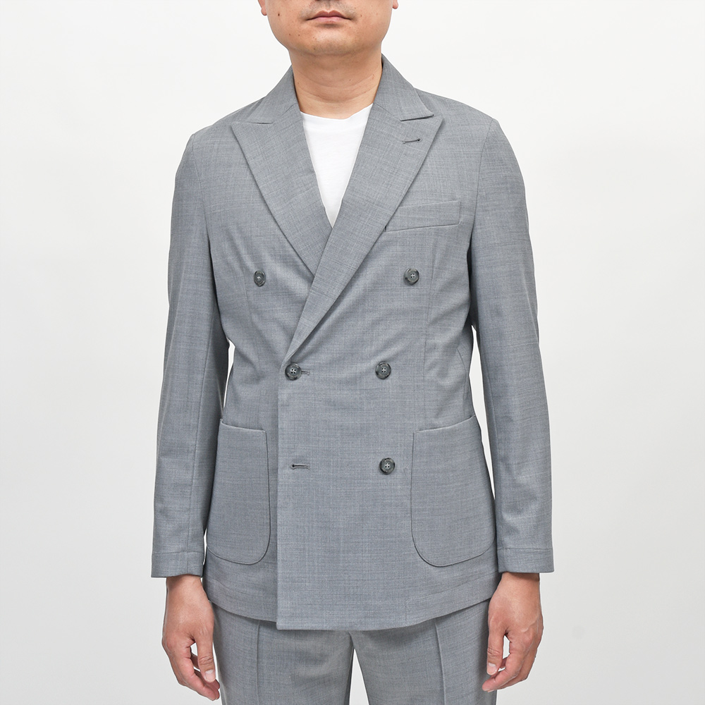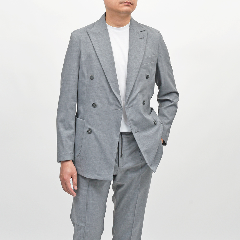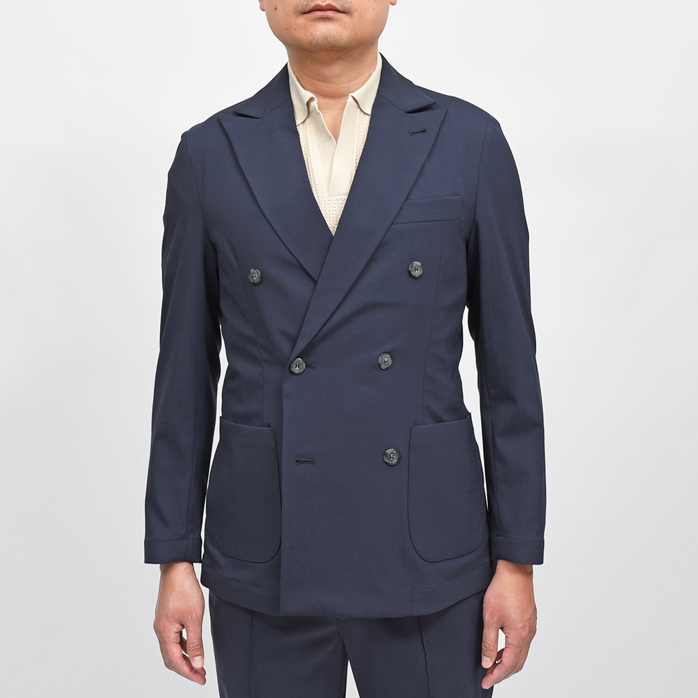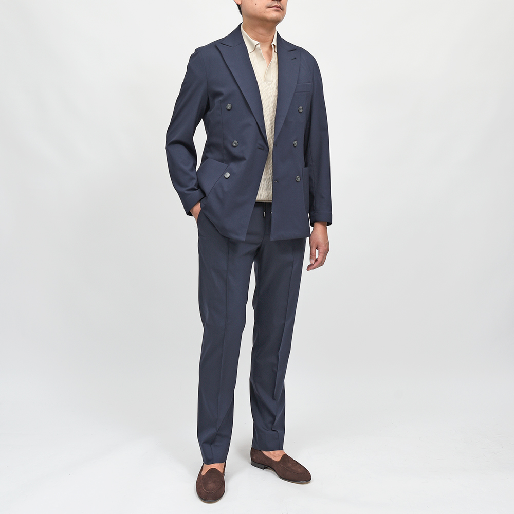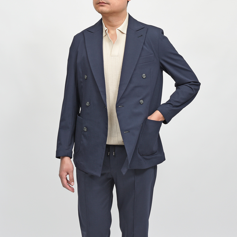 シンプルなコーディネイトでもダブルブレストのジャケットであれば、サマになるスタイルを作り上げてくれます。