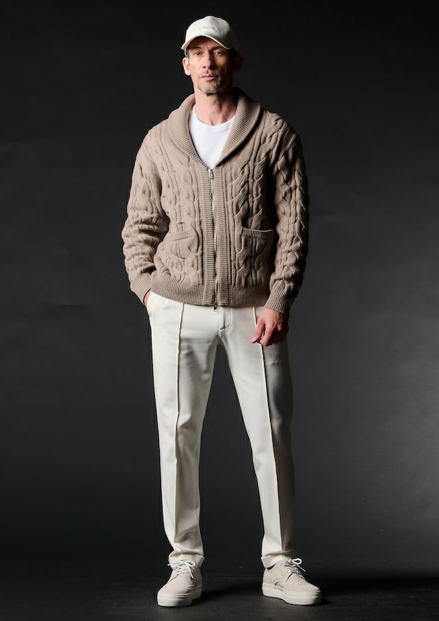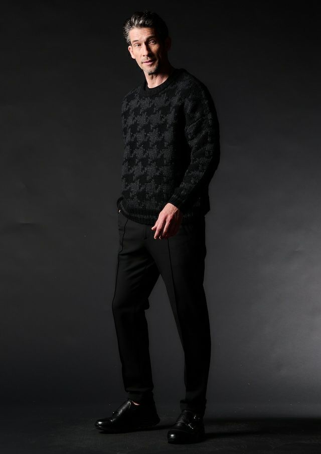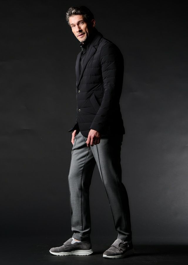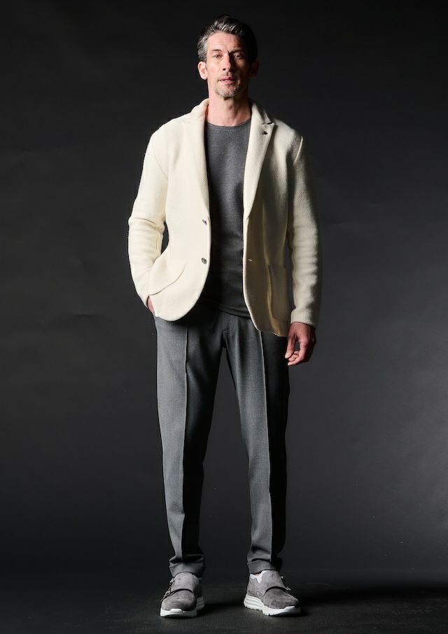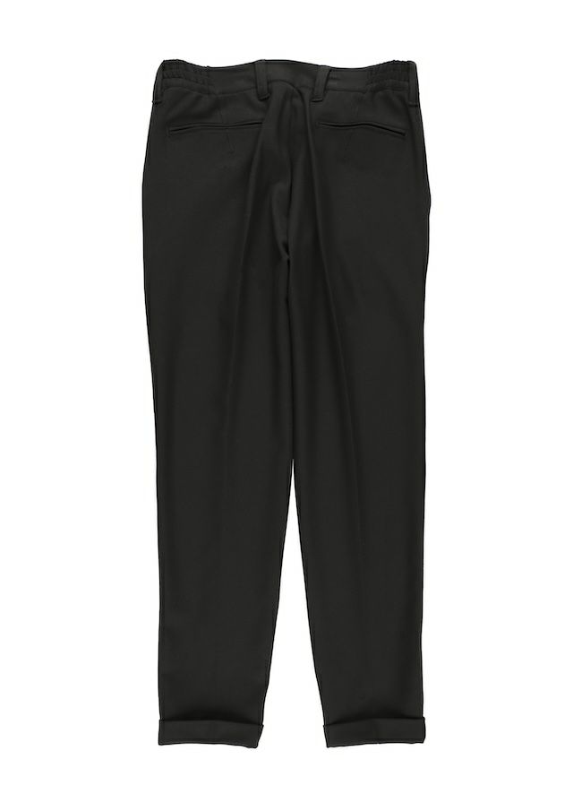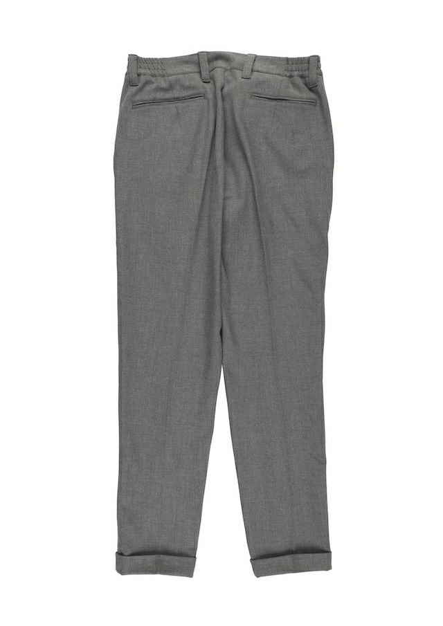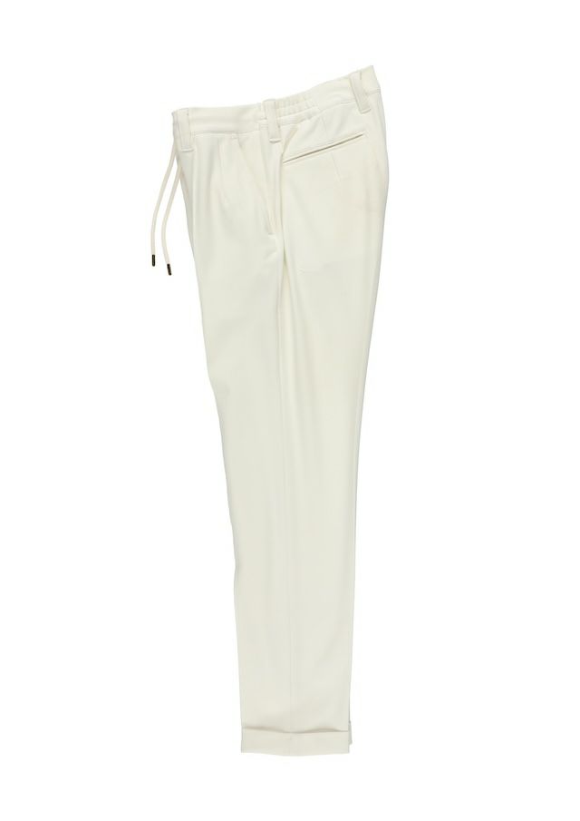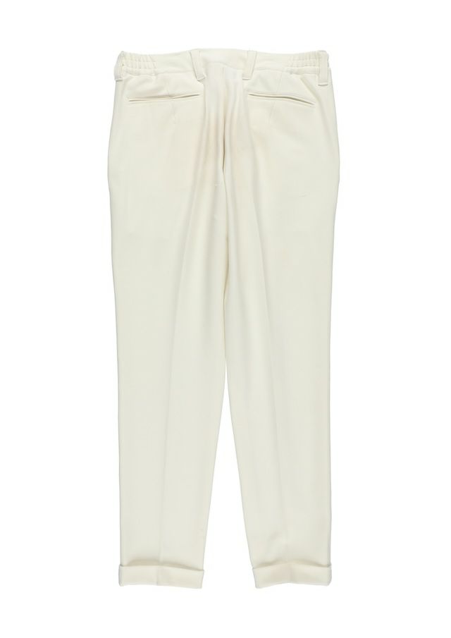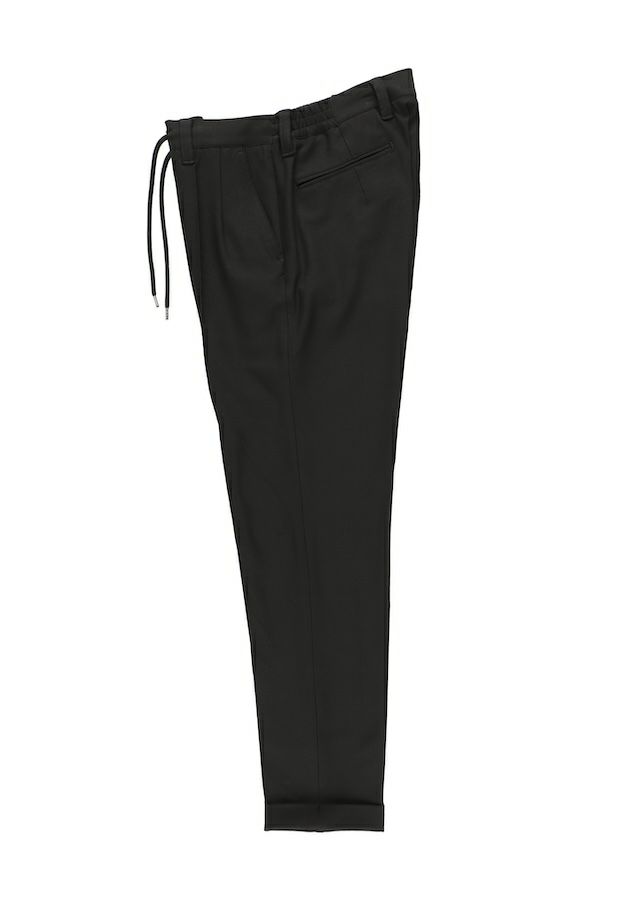 クラシックなトラウザーズから生み出したセンタークリーススラックスの登場です。「トラウザーズ」は同じボトムスでもスーツに合わせられる礼装用という意味合いが強いフォーマルな名称でありこの語源に基づきフォーマルをカジュアルダウンさせた企画としてデザインしています。テーパードの美しいシルエットとピンタックを入れたフロントのセンタークリースが特徴的で裾始末はクラシックなダブル仕立て。ウエストシャーリングリブとドローコードにてリラックスして着用しても良し、ドローコードを内側に落とすことでベルト着用も可能な2WAY仕様です。前開きはZIPPERフライ、釦は1PIU1UGUALE3ロゴ入り本水牛釦を採用しています。