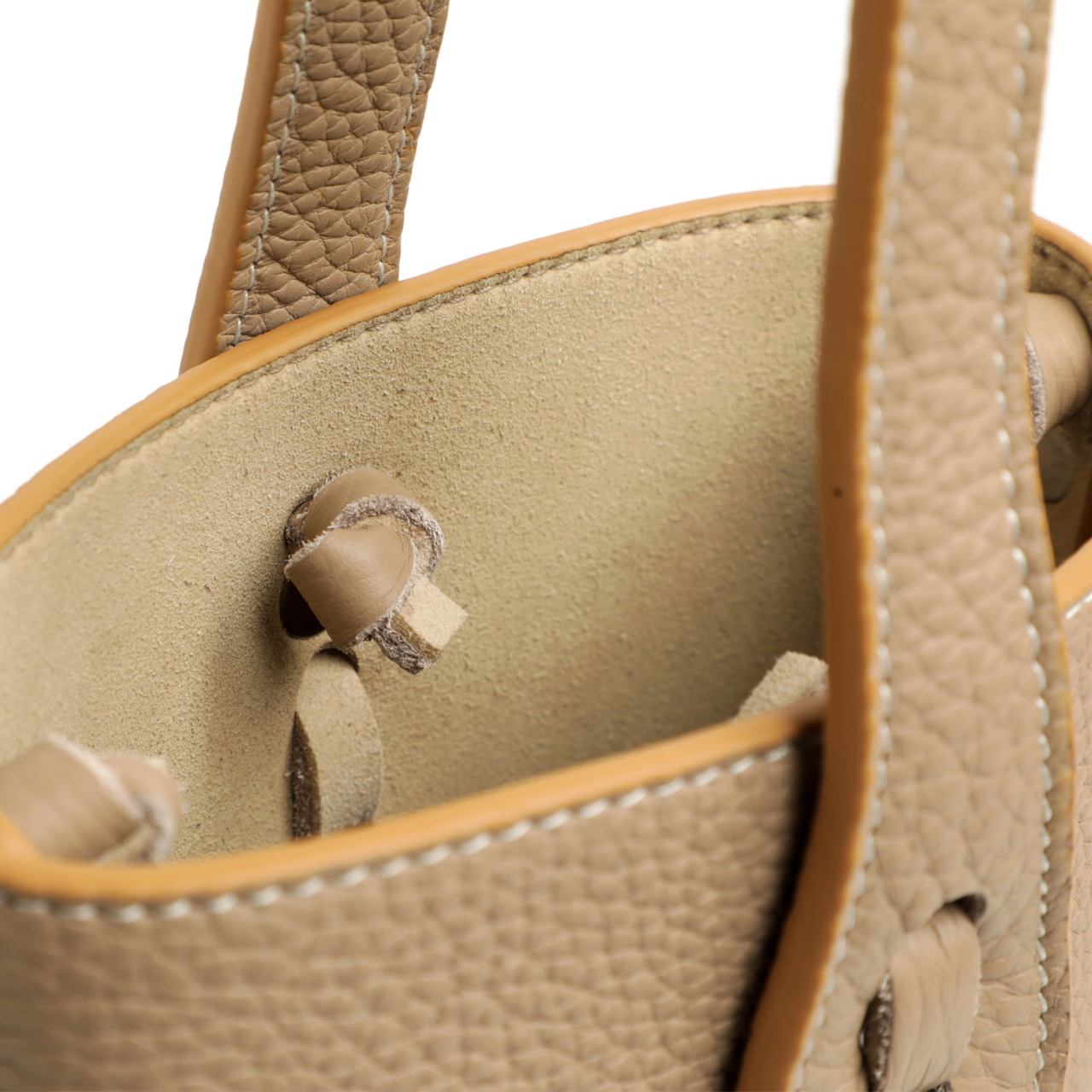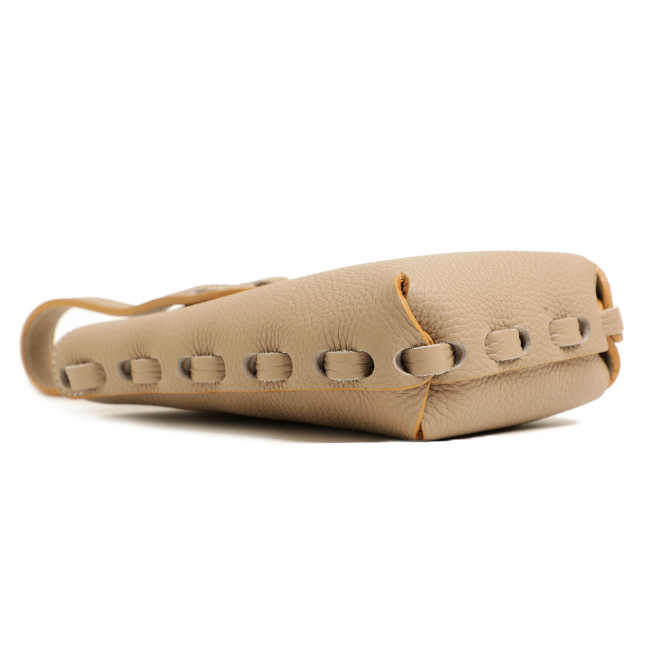 作りに関してもさすがとうなるものに。ボディは二枚の革を約1cm幅の革紐を通して合わせて、ハンドルも同様にメインのレザーとボディ部分を革紐で合わせています。底面部分は切り込みを入れて重ねてマチを作るなど、細かな技術が注がれています。