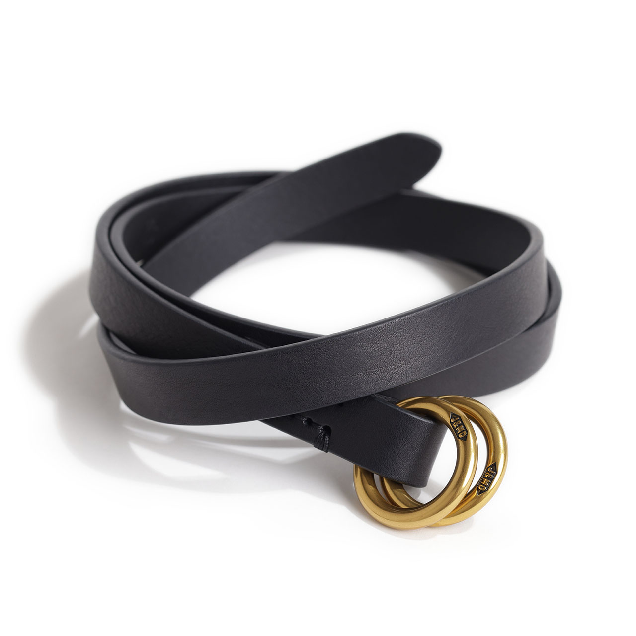 RING BELTはシンプルなレザーとロゴが刻印されたシンプルなデザイン。ゴールド、シルバーのそれぞれのバックルがスタイリングに品をプラス。