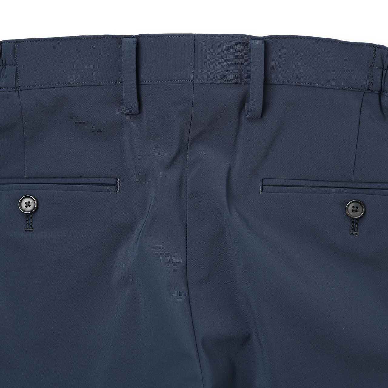 フロントは二つボタンとカギホック付きで、内側のテングと呼ばれるパーツによってすっきりとお腹を押さえます。ウエストサイズのお直しも可能な構造、股ズレや縫い目のほつれを防ぐシックなど、クラシックパンツの勘所が盛り込まれています。